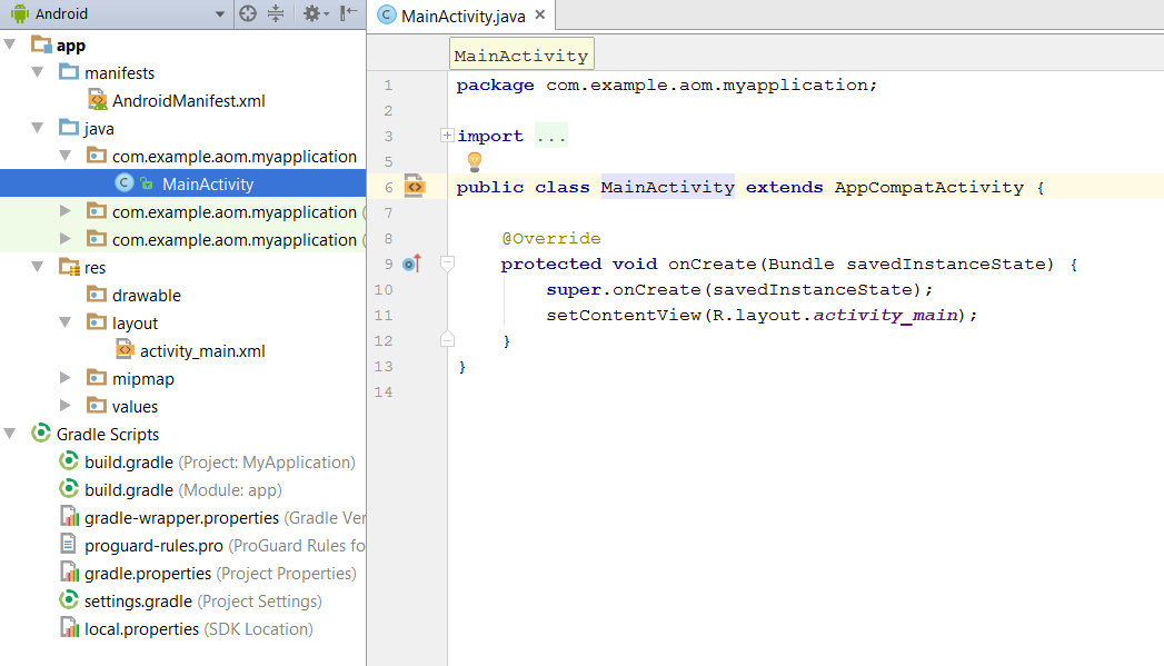 Android Studio จะใช้ภาษา java ในการเขียนโปรแกรม ดูจาก MainActivity